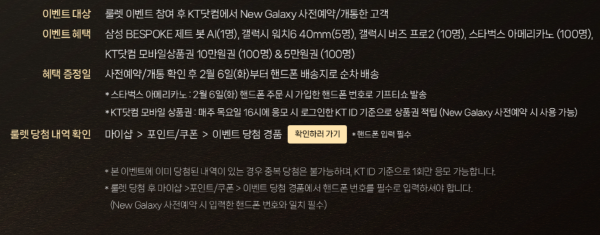 이벤트 대상 : 룰렛 이벤트 참여 후 KT닷컴에서 뉴 갤럭시 사전예약 / 개통한 고객