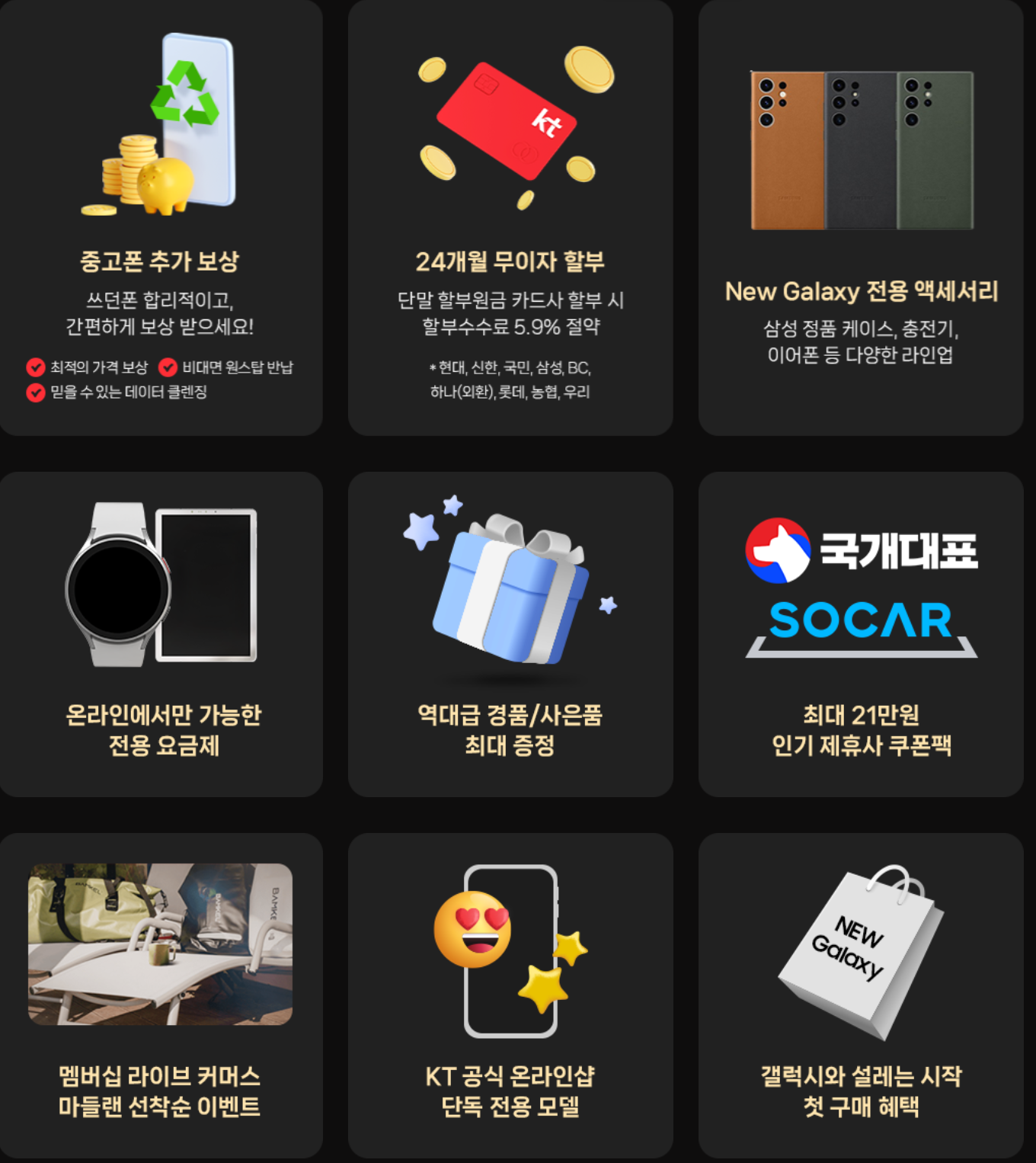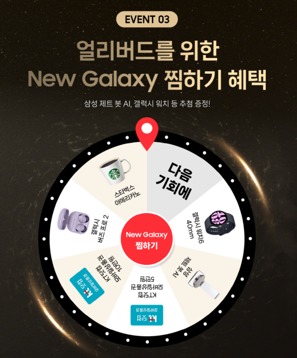 이벤트 혜택 : 삼성 비스포크 제트 봇 AI, 갤럭시 워치 6, 갤럭시 버즈 프로2, 스타벅스 아메리카노, KT닷컴 모바일삼품권 10만원권 & 5만원권