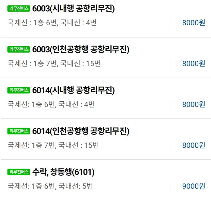 | 6003 (인천공항행 공항리무진) | 김포공항 → 인천공항 | 8000원 |
