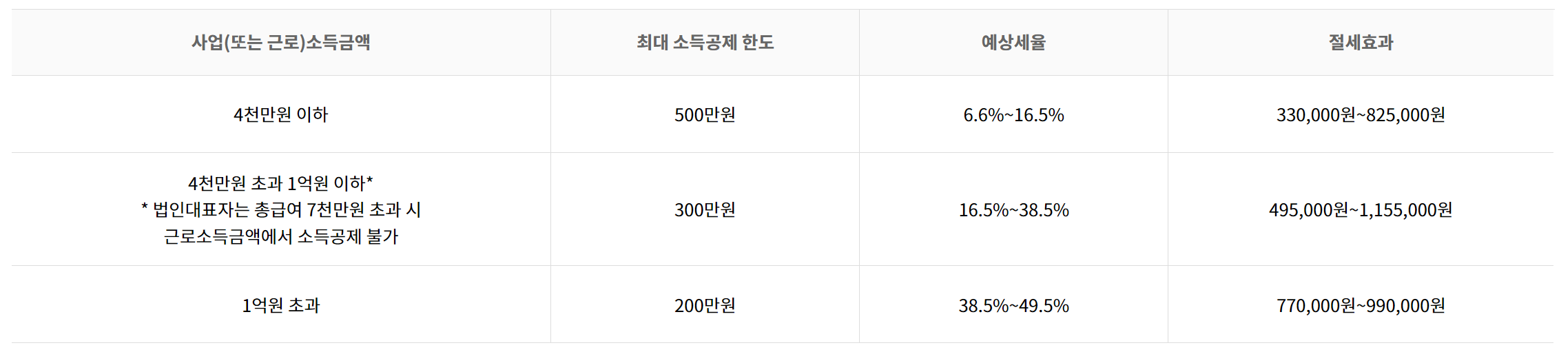 | 사업(또는 근로) 소득금액 | 최대 소득공제 한도 | 예상세율 | 절세효과 |