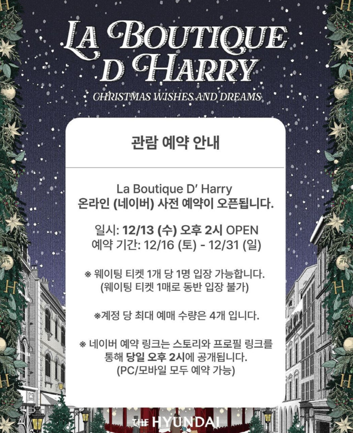 올해도 LA BOUTIQUE D’ HARRY 라느 이름으로 크리스마스 팝업을 하는데 사전예약을 해야만 이곳에 들어갈 수 있습니다.
