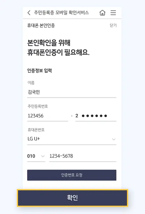 정보 입력: 성명, 주민등록번호 등 필수 정보를 입력합니다.
