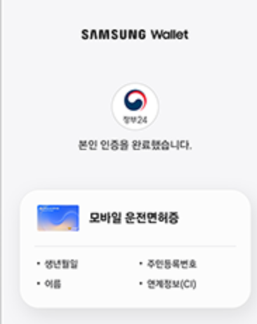 삼성페이를 통해 모바일 신분증 발급: 모든 절차를 완료하면 삼성페이를 통해 모바일 신분증이 발급됩니다.