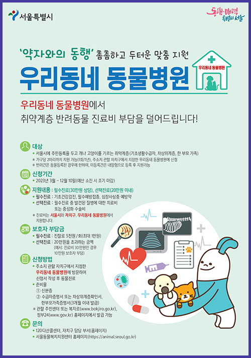 그래서 서울시에서는 ‘우리동네 동물병원’이라는 취약계층의 반려동물을 위해서 경제적으로 지원을 해 주는 사업을 하고 있어요.