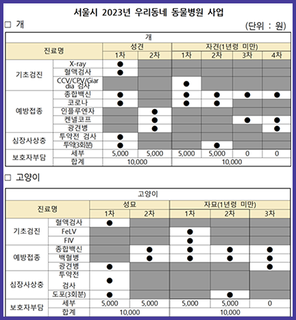 주민등록상 서울시에 거주하고 개나 고양이를 기르는 취약계층을 대상으로 합니다.