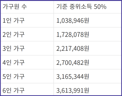 2023년 기준 중위소득 50%는 아래와 같습니다.