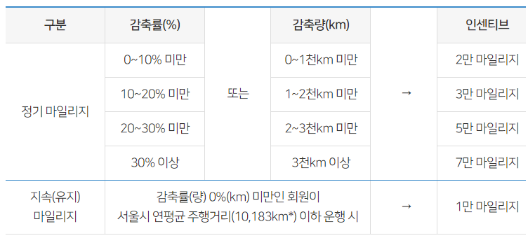 1년 단위로 서울시 연평균 주행거리 이하로 운행 시 1만 마일리지 지급(정기 마일리지 지급 대상 차량 제외)
