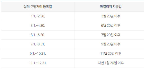 매년 홀수 달 평가(이전 2개월 동안 실적 주행거리 등록한 차량 대상) 후 마일리지 지급