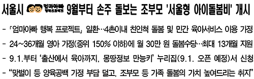 그래서 서울시는 지난해 8월에 '엄마아빠 행복 프로젝트'를 발표하면서 많은 주목을 받았는데 이 프로젝트의 핵심은 '서울형 아이돌봄비' 지원 사업입니다.