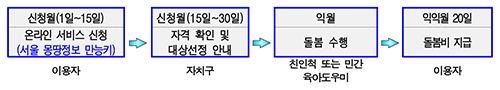 신청이 완료되면 각 자치구에서 자격확인을 거쳐 지원대상을 선정‧안내 하며, 익월에 돌봄활동이 시작됩니다.