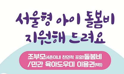 친인척의 돌봄 지원을 받기 어렵거나 민간 아이돌봄서비스를 선호하는 경우에는 서울시가 지정한 서비스 제공기관을 이용할 수 있도록 월 30만 원 상당의 이용권을 받을 수 있습니다.