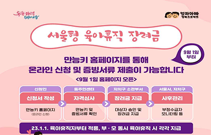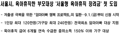 서울시는 "엄마아빠 행복 프로젝트"의 일환으로 육아휴직한 직장인 엄마아빠를 위한 '서울형 육아휴직 장려금'의 신청 및 접수를 9월 1일부터 시작한다고 발표했습니다.