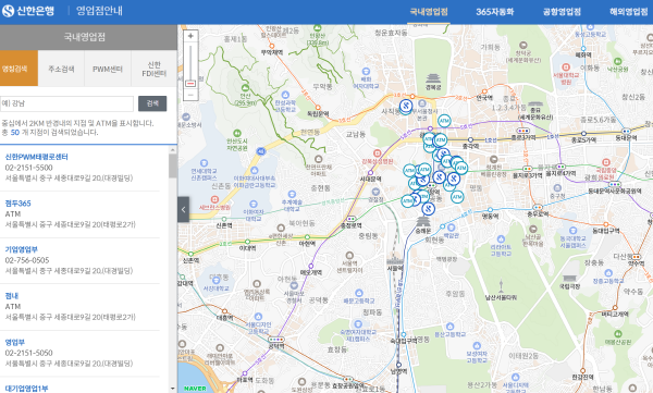 신한은행의 국내영업점과 365 자동화 ATM 기기가 있는 곳, 공항영업점, 해외영업점을 검색해 보실 수 있습니다.