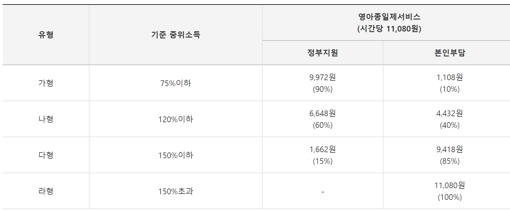 2023년 영유아종일제 소득유형별 정부지원금 및 본인부담금