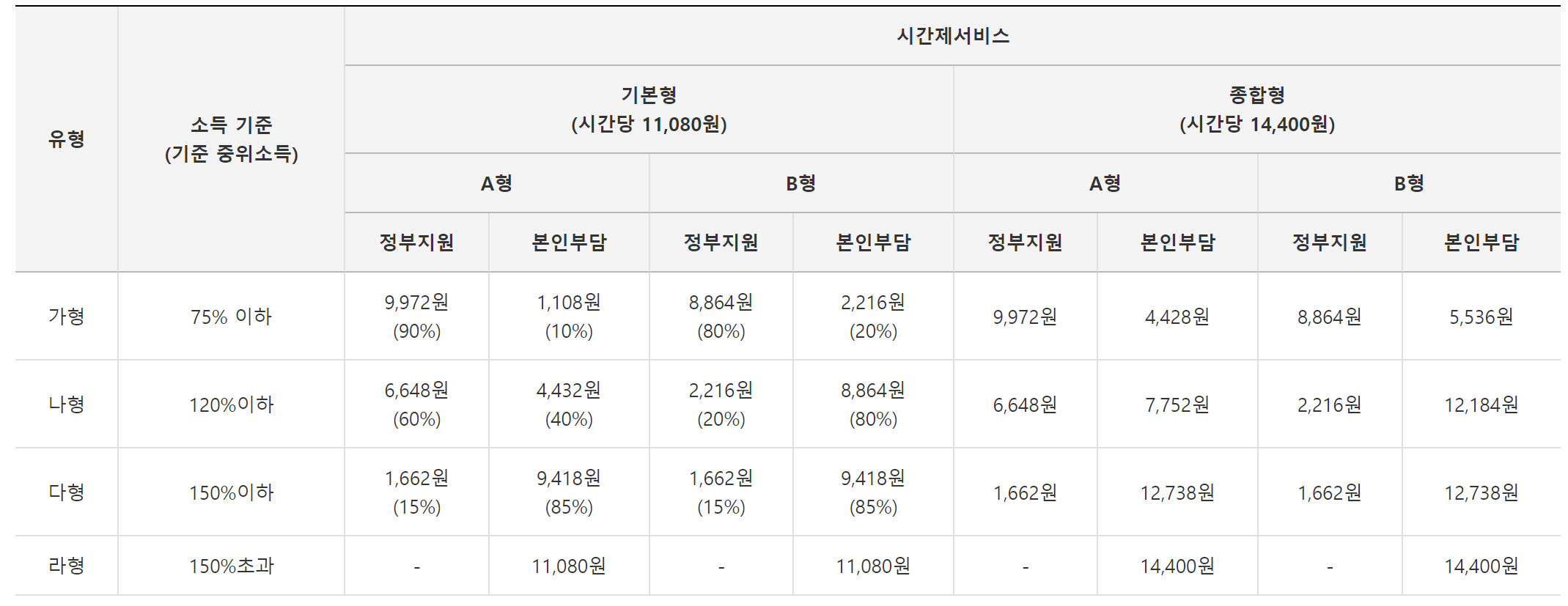 2023년 시간제서비스 소득유형별 정부지원금 및 본인부담금