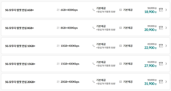 5G 모두다 맘껏 안심 요금제는 통화무제한에 데이터를 6~20GB까지 선택이 가능한데 데이터를 모두 사용하면 400 kbps로 데이터를 이용할 수 있습니다.