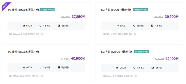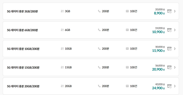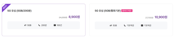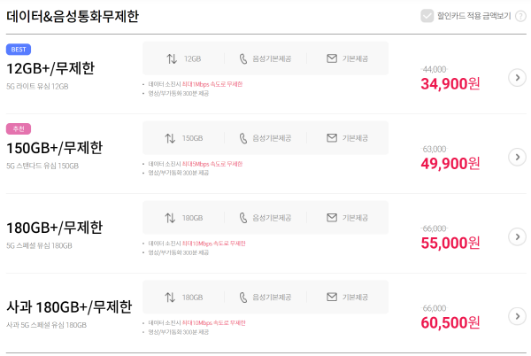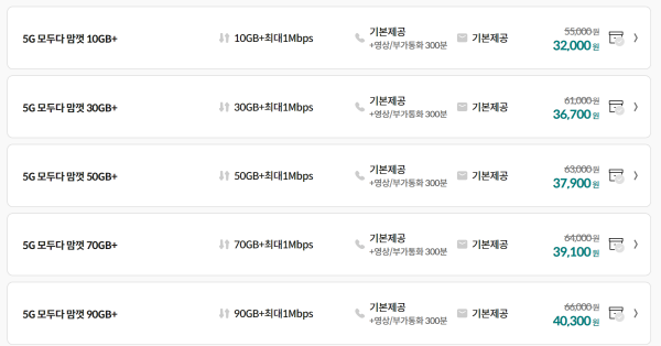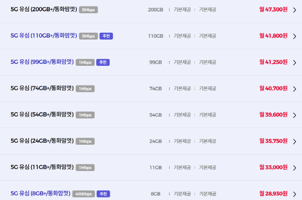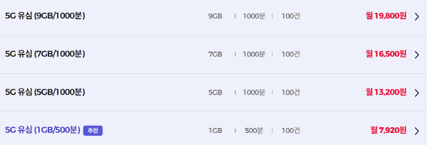 U+유모바일의 5G 은 데이터의 요금에 따라서 나누어집니다.