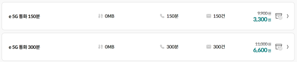 5G e 요금제는 데이터는 없고 통화만 150분, 300분 가능한 요금제인데 가격이 무척 가볍습니다.