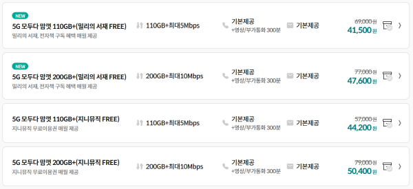110GB나 200GB의 데이터를 선택 시 밀리의 서재나 지니뮤직을 무료로 이용할 수 있습니다.