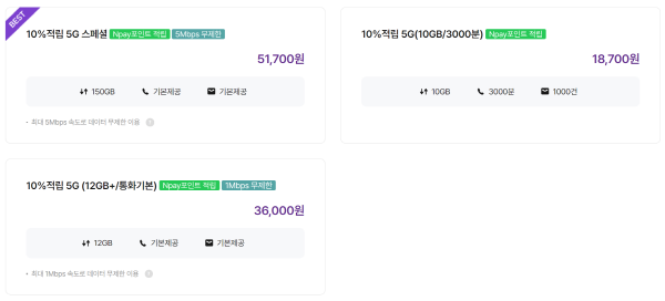 5GB, 10~15GB, 50~125GB, 스페셜, 10% 적립 요금이 있습니다. 대부분은 통화는 무제한이고 데이터가 50GB 이상인 경우는 데이터를 다 쓴 후에 1 Mbps~5 Mbps의 속도로 데이터를 사용할 수 있습니다.