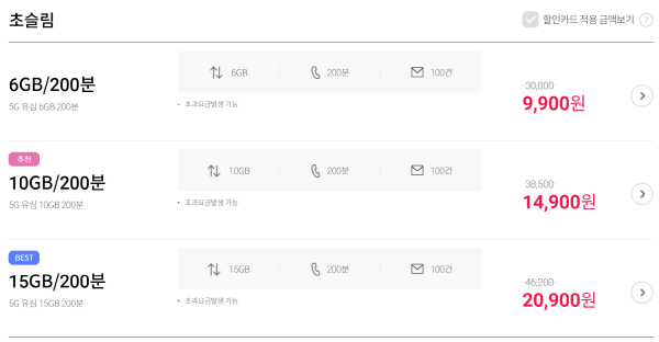 초슬림 요금제는 6~15GB까지 데이터를 쓸 수 있고 통화는 200분이 무료이고 이름 대로 통신요금이 슬림한 게 특징입니다.
