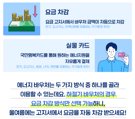 에너지바우처는 동절기에는 요금차감이나 실물카드 중 하나를 선택해서 이용할 수 있습니다.