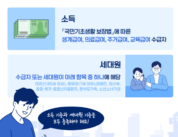 소득 기준과 세대원 기준을 모두 충족해야 합니다.