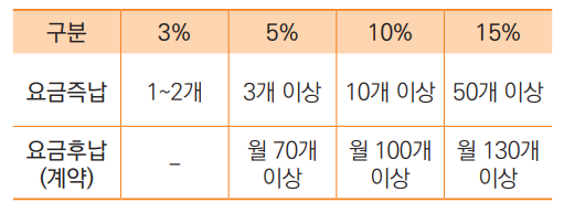 | 3% | 1~2개 | - | 개당 500원 감액(고객이 직접 모바일 등으로 접수정보 입력, 사전결제, 픽업 장소지정 시) | 중량 20kg초과 소포 1개를 2개로 분할하여 접수할 경우(△ 2,000원) 감액* 동일 시간대, 동일 발송인, 동일 수취인이고, 분할한 소포 1개의 무게는 10kg을 초과할 것 | |