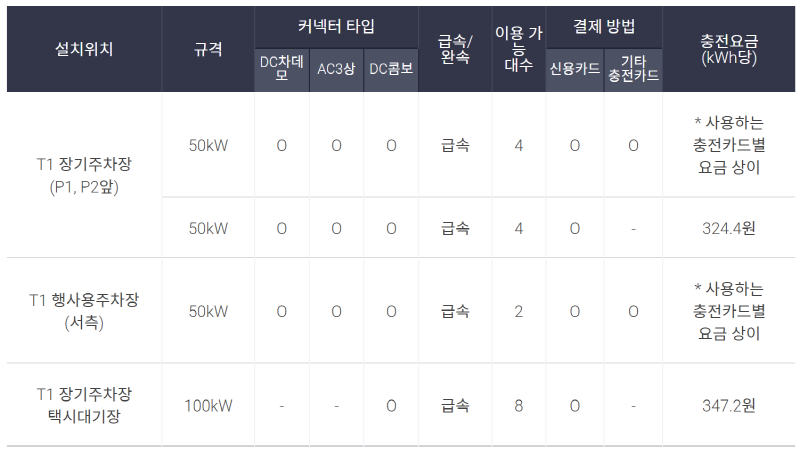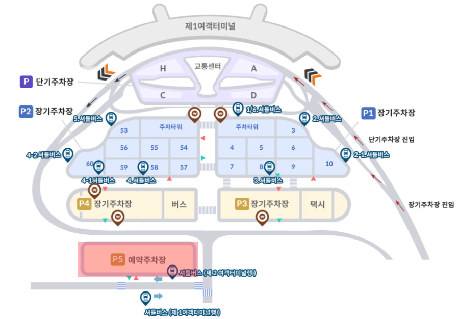 T1 장기주차장 (P1, P2앞), T1 행사용주차장 (서측), T1 장기주차장 택시대기장