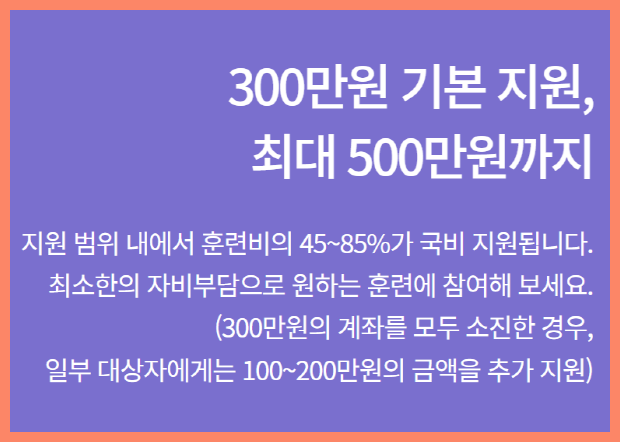 고용노동부 직업훈련포털에 등록된 훈련과정에 사용할 수 있는 지원금 300만원이 지급됩니다.