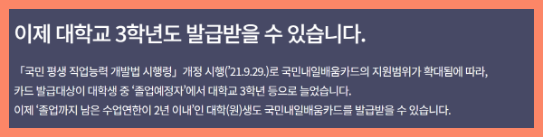 이제 ‘졸업까지 남은 수업연한이 2년 이내’인 대학(원)생도 국민내일배움카드를 발급받을 수 있습니다.