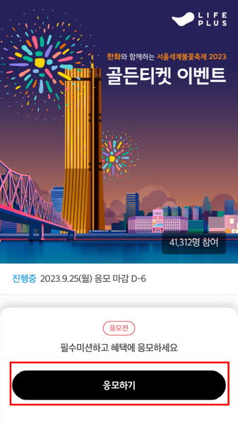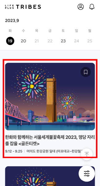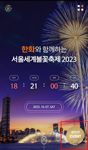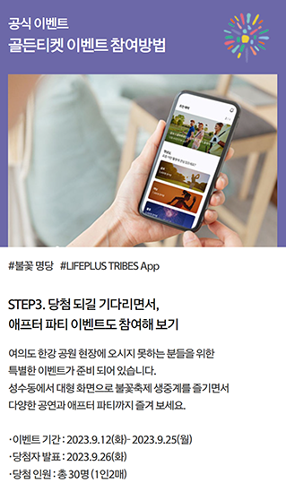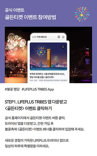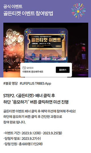 공식 홈페이지에서 골든티켓 이벤트 버튼 클릭하고 트라이브 앱을 다운로드하고, 간편 가입 후 불꽃축제 <골든티켓> 이벤트 배너를 클릭하여 입장해 주세요.