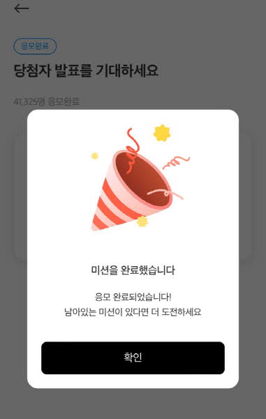 하단에 응모하기 버튼 클릭 후 간단한 과정으로 참여 완료가 됩니다.