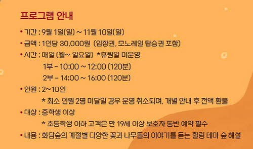| ✅ 미취학 아동 단체 입장요금 할인 : 3,000원 미취학 아동 30명 이상 가을 단풍 시즌(10, 11월) 할인 미운영 |