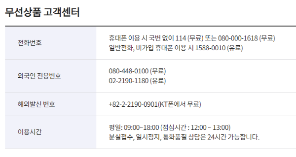 KT가입 고객의 경우는 청구요금, 납부, 휴대폰 가입, 기기변경, 선택약정 할인, 요금제와 부가서비스, 소액결제, 휴대폰 정지, 분실, 통화품질 문의, 로밍등을 문의하실 수 있습니다.
