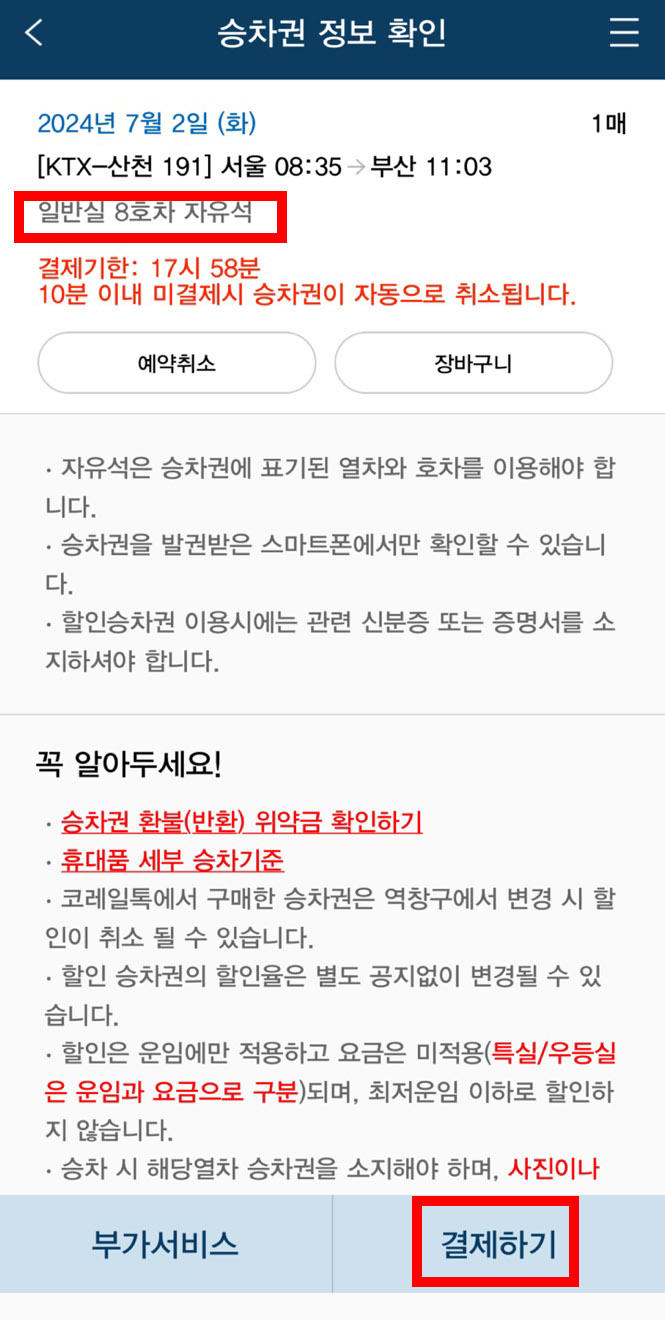 KTX 자유석을 선택하고 본인이 선택한 승차권이 자유석이 맞는지 확인합니다.