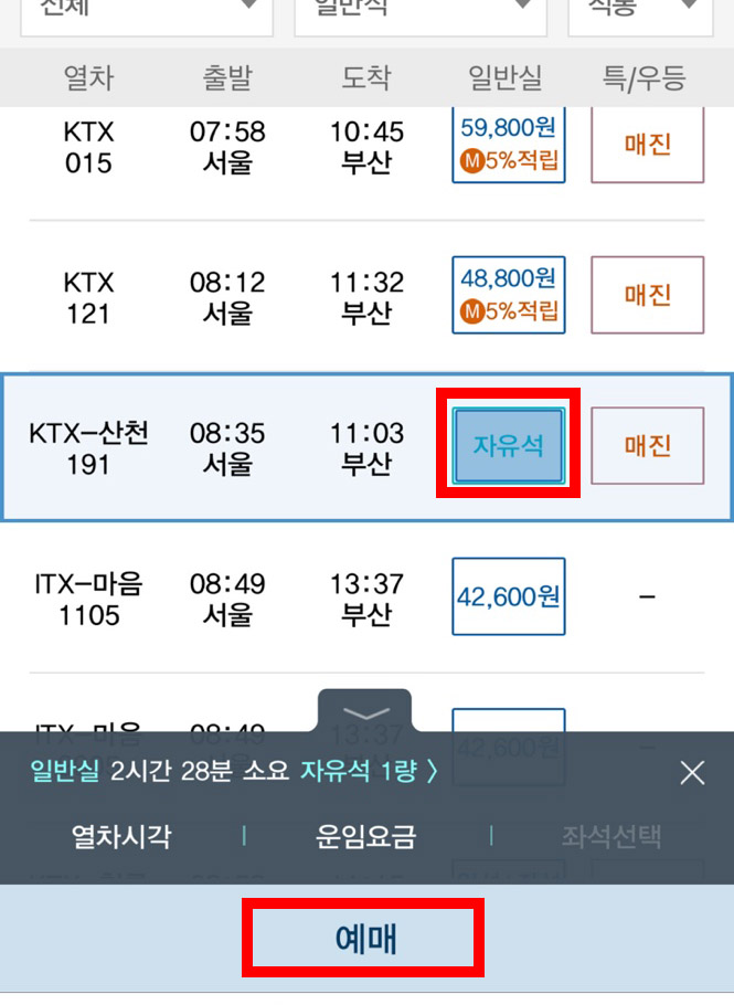검색된 열차 목록에서 자유석이 있는 열차를 선택합니다.