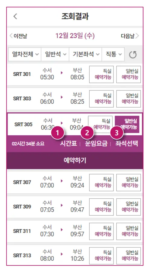 조회결과에 나온 열차중에 선택해 주시면 됩니다.
